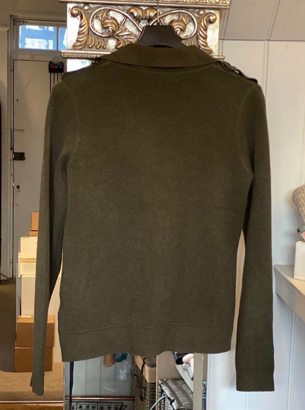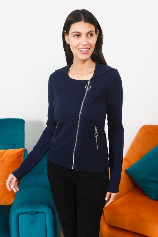 The jacket has a left of centre front zip with two matching zips on the two front pockets. it has two buttoned epaulettes and a delightful metal heart pendant near the front left pocket. Wear with zip up (image 1) when it is chilly and zip half way down to reveal the cute collars (image 2). Image 3 = back of jacket. Image 4 = model wearing grey. Images 5,6,7 = model wearing navy. Image 8 = fabric & care